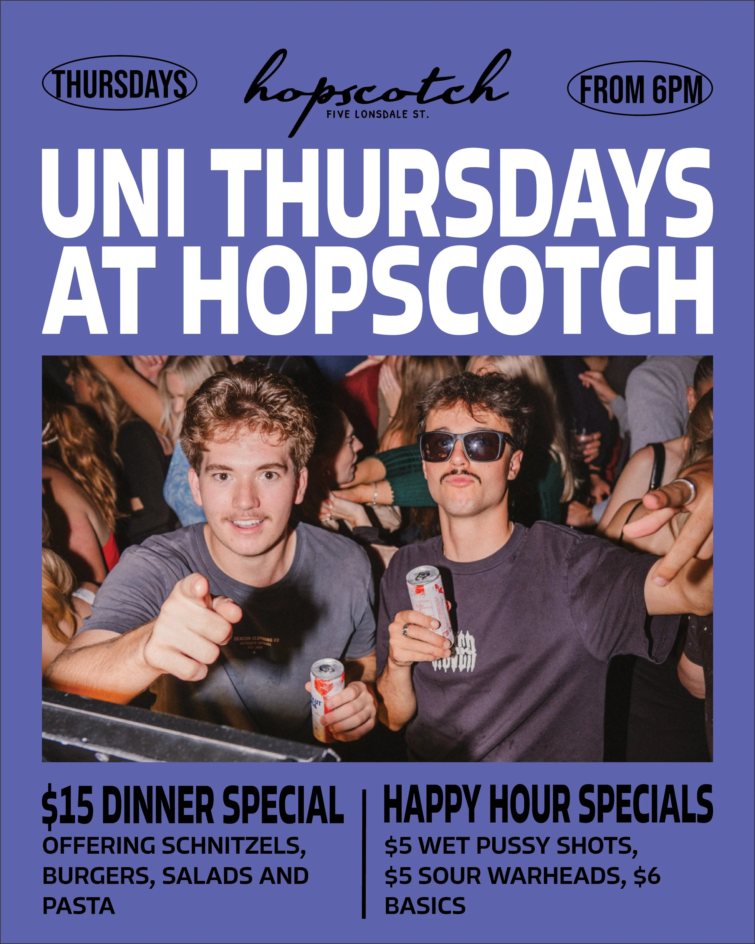 Student life just got better! Join us every Thursday for $15 dinners and $5 basics and shots. Gather your uni crew, fuel up, and make the most of your night—Hopscotch style.