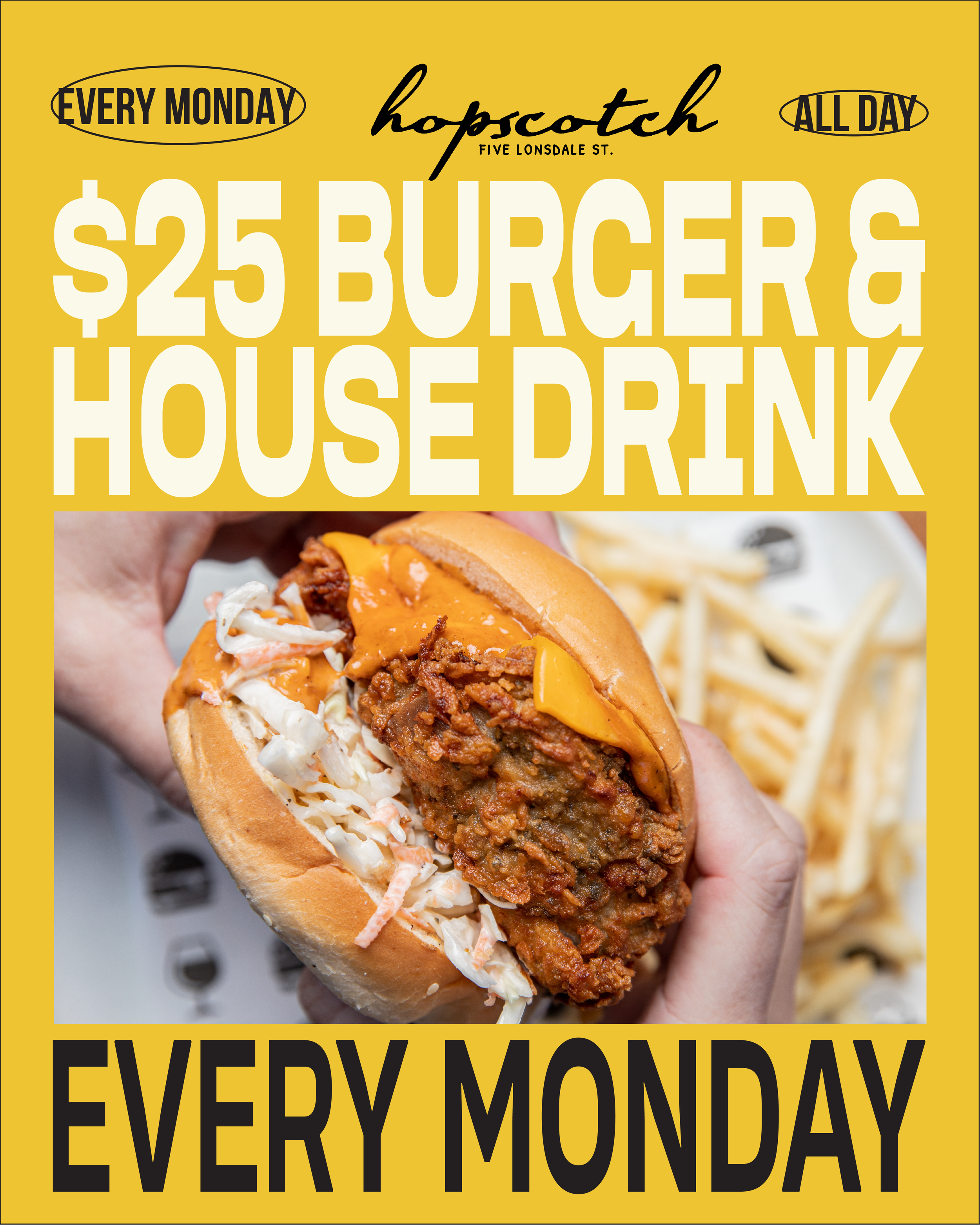 Kick off your week with free trivia every Monday! Test your knowledge and enjoy our $25 burger and house drink combo. Gather your team and make Mondays something to look forward to at Hopscotch